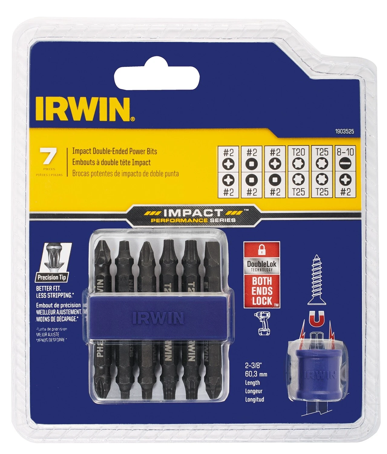 - Set includes 6 double-ended 2-3/8 bits: 1 PH#2/PH#2, 1 SQ#2/SQ#2, 1 PH#2/SQ#2, 1 T20/T25, 1 T25/T25, one 8-10SL/PH#2; plus 1 magnetic screw-hold attachment