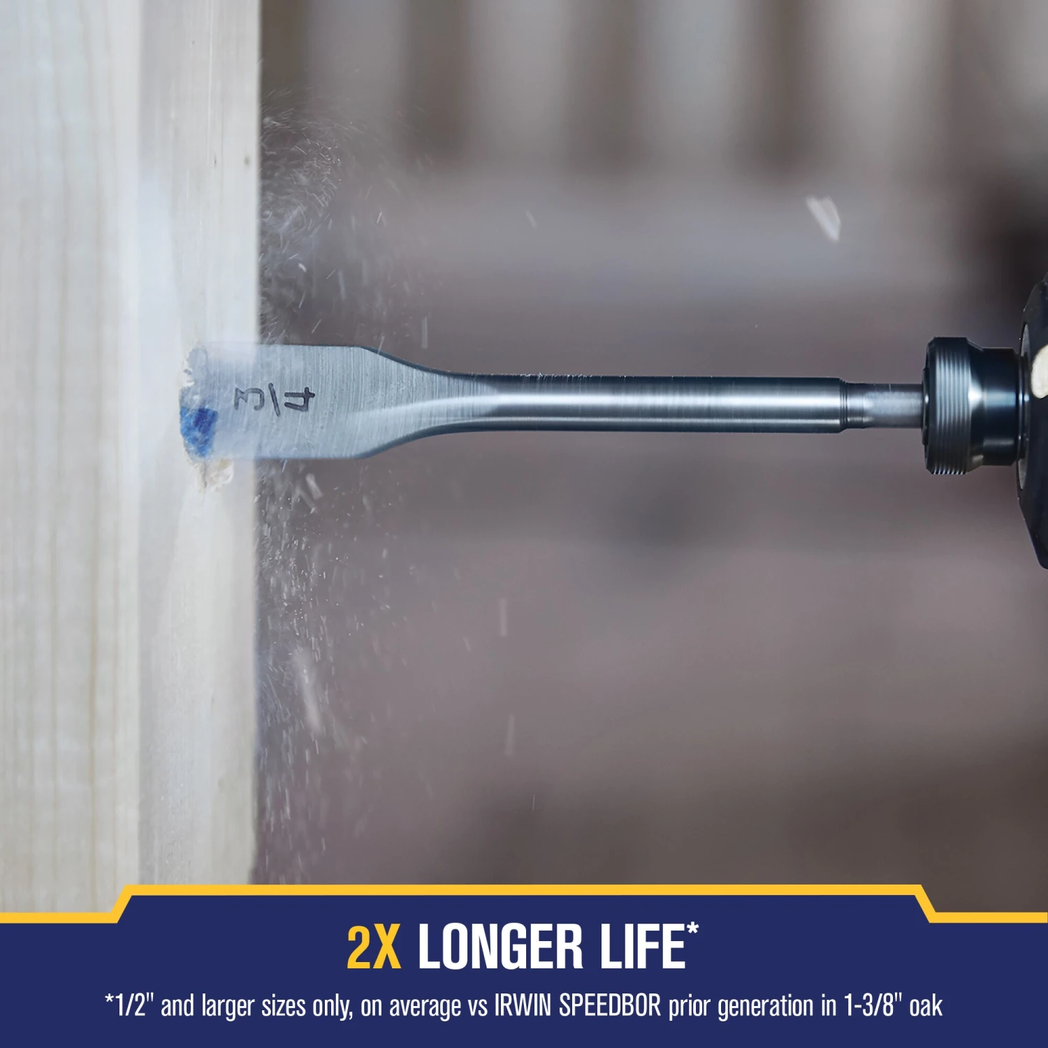 Next-generation SPEEDBOR® Spade Bits feature a chamfered cutting edge for durability in cutting wood. Patented Blue-Groove cutting edge allows for aggressive removal of wood chips and fast drilling.